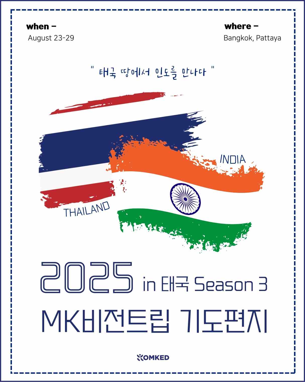 인도에서 온 후배 MK들을 만나기 위해 8명의 선배 MK들이 특별한 비전을 가지고 태국 파타야로 향했습니다. 단순한 여행이 아닌, 사랑과 격려, 그리고 하나님의 마음을 전하는 비전트립이었습니다. 출발 전, 기도편지를 통해 많은 후원자분들의 따뜻한 응답으로 덕분에 아이들이 좋아하는 한국 간식, 그리고 특별한 콤케드 티셔츠까지 선물할 수 있었습니다.🎁